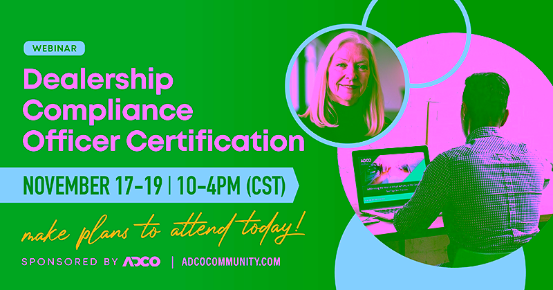 ADCO 's Basic Essentials Compliance Officer Seminar and Certification offers a comprehensive curriculum designed to help dealership compliance officers implement and manage a Compliance Management System (CMS). Participants can expect to learn about dealership compliance responsibilities, federal regulations in the F&I and Sales arena, leadership skills, and tools to minimize risks and protect the dealership's financial health.